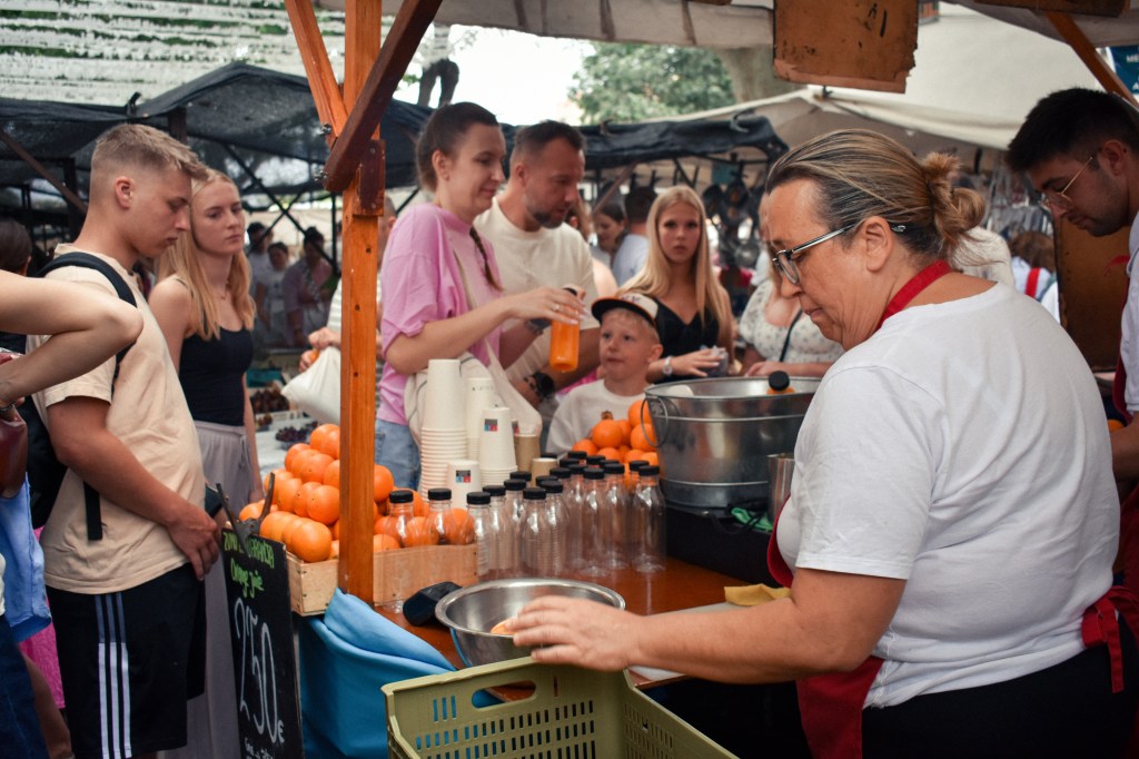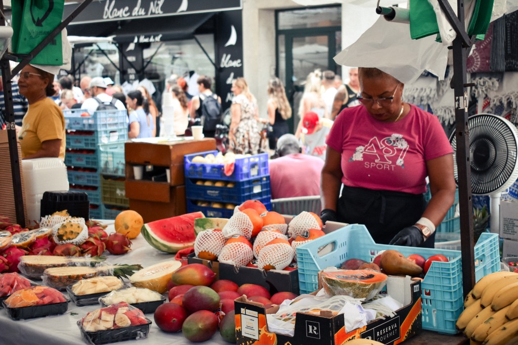 The sun dimmed under the reaching canopy as we walked through to the food stalls. Reams and reams of huge fruits and wonky vegetables, stacked in proud pyramids. Boastful in some way – quartered watermelons the size of a small child – and some entirely unfamiliar. Every piece being picked up and observed, given its own time of day. It was as if these vendors understood our British need to devour these treasures then and there. I watched as kids reached for cups of cubed melon and bottles of freshly squeezed orange juice to wander around with. They knew what they were doing here.